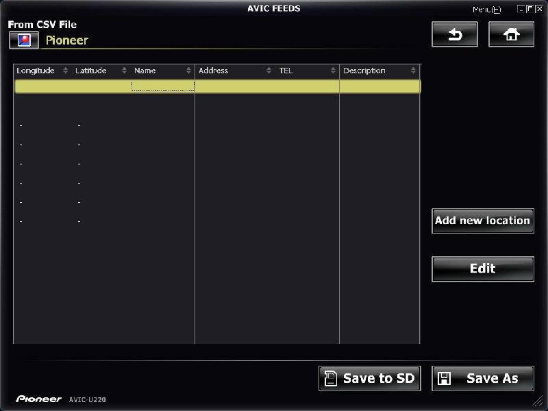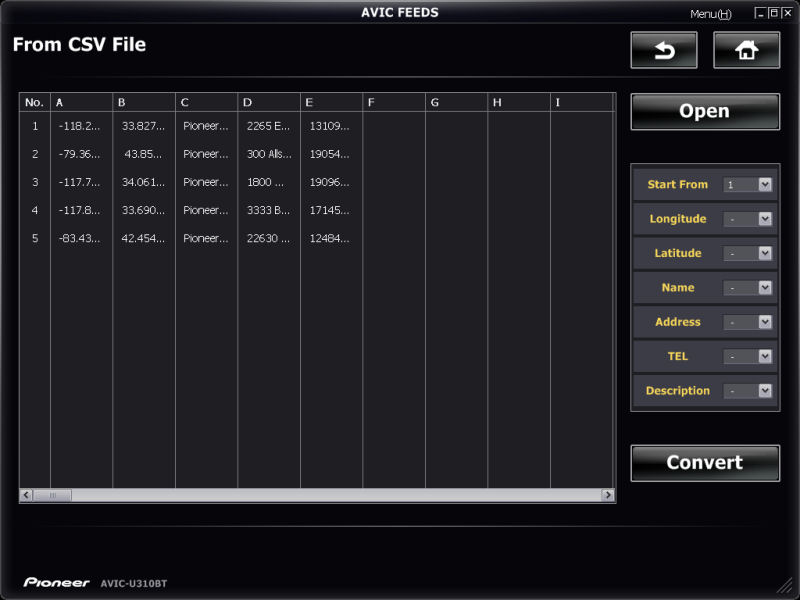 Vous pouvez convertir les données de PDI du format CSV à un format qui est supporté par le systeme de navigation pour automobile. Vous pouvez transférer les données au systeme de navigation pour automobile via un périphérique mémoire USB ou une Carte SD. (*Pour charger des POI depuis un fichier CSV vous devez avoir les informations longitude et latitude.)