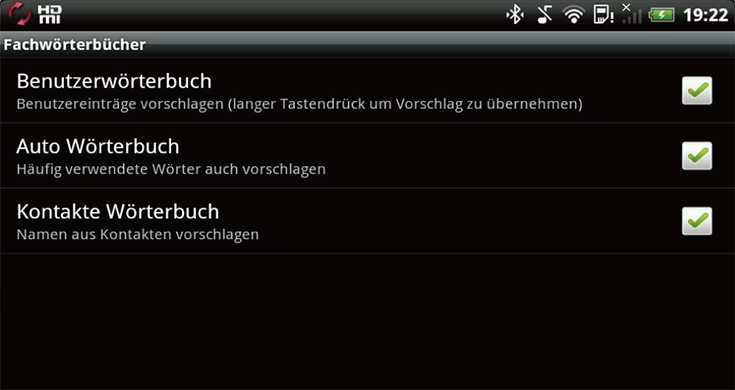 3 Tippen Sie das zu verwendende Wörterbuch an und markieren Sie das Kontrollkästchen.